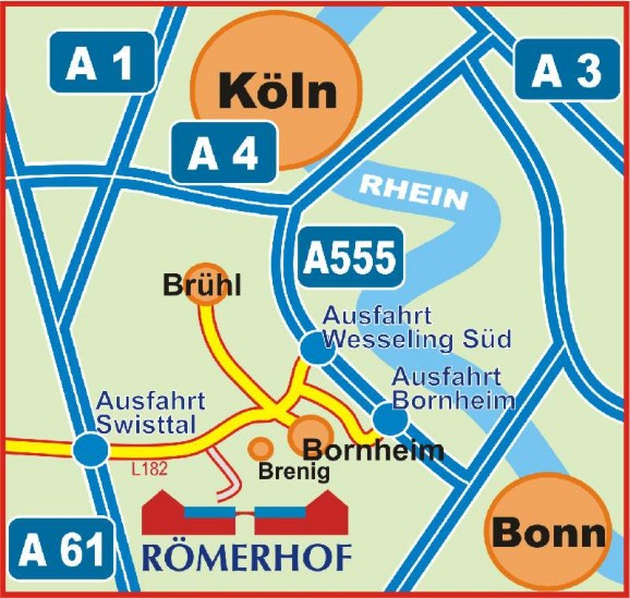 aus Bonn über die A555 kommend Ausfahrt Bornheim, dann über die L118, L281, L192 Richtung Bornheim, ab Kreuzung über die L182 RIchtung Euskirchen bis zur Einfahrt (links) "Golfanlage Römerhof"