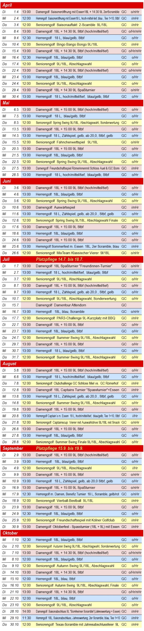 WETTSPIELKALENDER 2025 - Damen/Herren/Senioren-Golf