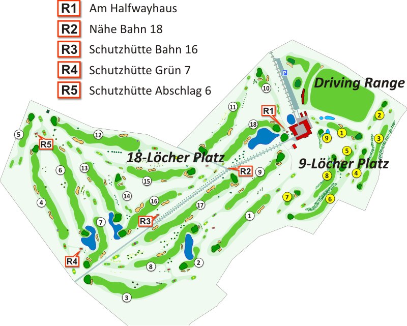 Mein Standort: Golfanlage Römehof, großer/kleiner Platz, Bahn... Falls in der Nähe eines der 5 Rettungspunkte R1, R2, ...., R5 (siehe Lageplan unten), dann diesen nennen: zB. "R3"