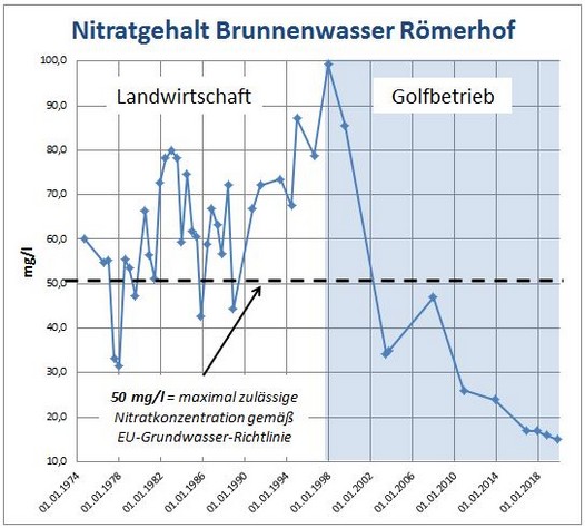 Kleiner Beitrag zur aktuellen Diskussion um die Grundwasser-Belastung durch Überdüngung: parallel zur Aufnahme des Golfbetriebs hat sich die Qualität unseres eigenen Brunnenwassers kontinuierlich verbessert. Lag dessen Nitratgehalt während der landwirtschaftlichen Bodennutzung zuletzt sogar bei 100 mg/lt (1998), ging er seither fast kontinuierlich zurück. Letzter Messwert vom Dezember 2019: 15 mg/lt.